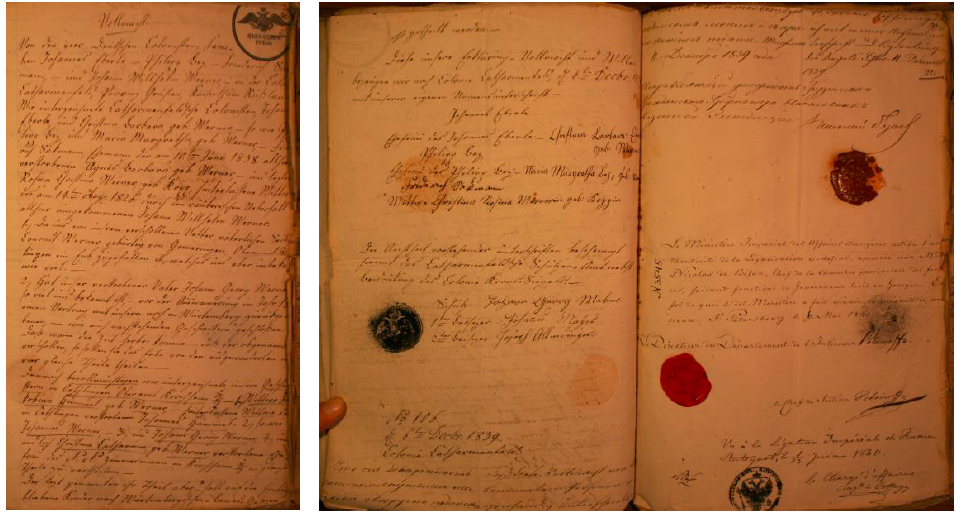 - Наш умерший отец Иоганн Георг Вернер, насколько мы знаем, заключил договор с нашими еще оставшимися в Вюртемберге братьями и сестрами до выезда в 1817 году. Когда придет время, что Конрадт Вернер пропал, они должны разделить наследство от выезжающих на четыре равные части. Следовательно, мы, подписавшиеся, доверяем нашим братьям и сестрам в Оэтлингене, округ Кирххайм-у.-Т., – 1. вдове Якобине Хуммель, род. Вернер, – оставшейся вдове Иоганна Хуммеля в Оэтлингене, 2. Иоганнесу Вернеру, 3. Иоганну Георгу Вернеру, 4. и наконец Кристине Катарине, род. Вернер, умершей жене Н.Н. Циммерманна в Кирххайм-у.-Т., чтобы разделить наследство на равные части. Доля последней должна быть разделена на оставшихся детей в соответствии с законами земли Вюртемберг.