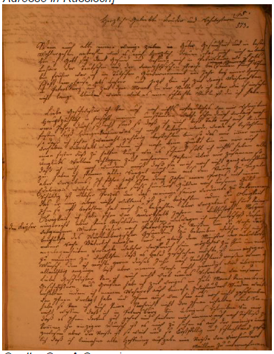 Wenn euch alle meine wenigen Zeilen in Guter Gesundheit und in besten Wohlergehen antreffen, wird es mich herzlich freuen, was mich (mich) anbelangt bin ich Gott sey Dank Gesund und befinde mich in Petersburg wo ich als Lehrer der Teutschen und der Franzhösischen Sprache bei einem General bei seinen fünf Söhnen bin.