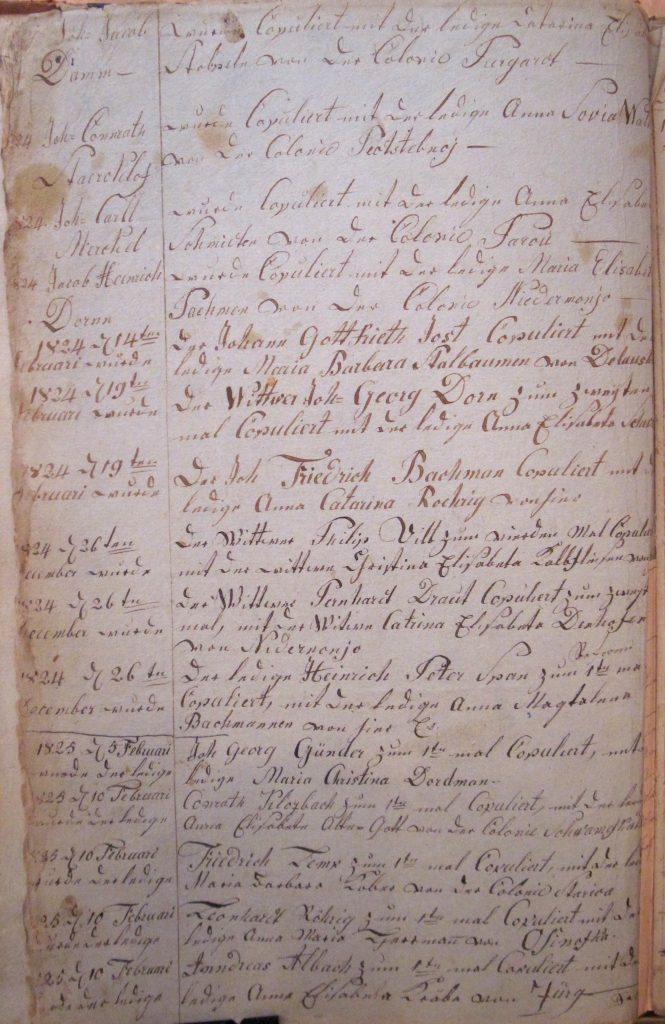 – В начале 1824 г. (скорее всего январь – начало февраля) венчались Johann Jacob Damm и Catharina Elisabeth Stoppel родом из колонии Boregardt.