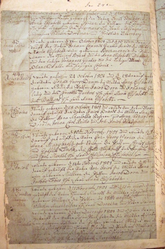 №44. 24.10.1801 родился сын Johann Jacob в семье Johann Georg Damm и Anna Elisabeth, урожденная Kind. Он был крещен 28.10.1801. Восприемники: Jacob Dorn, Johannes Gu…(далее фамилия заклеена реставрационной лентой, но по аналогии скорее всего эта фамилия – Gunter (Guenther)), Conrad Gunter жена Maria Elisabeth, жена Baltzer – Anna Elisabeth.